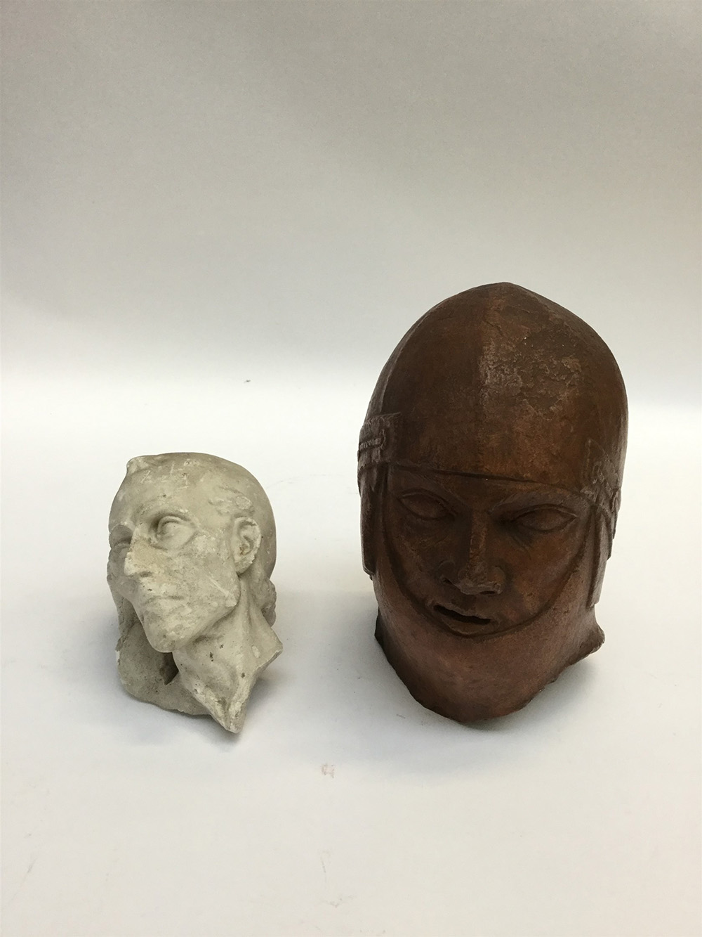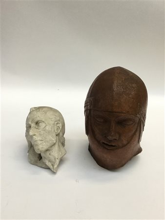 Lotto composto da una testa di crociato in terracotta dipinta (h cm 28), e una testa maschile in gesso (h cm 19) (difetti)