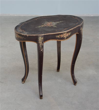 Tavolino ovale con gambe mosse in legno ebanizzato e dipinto a bouquet di fiori; secolo XX (cm 61x56x39)