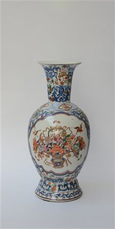 Vaso a tromba in porcellana policroma decorato con coppia di volatili e motivi floreali, marchi apocrifi sul fondo (difetti e mancanze) Giappone, sec. XX (h. 48 cm.)