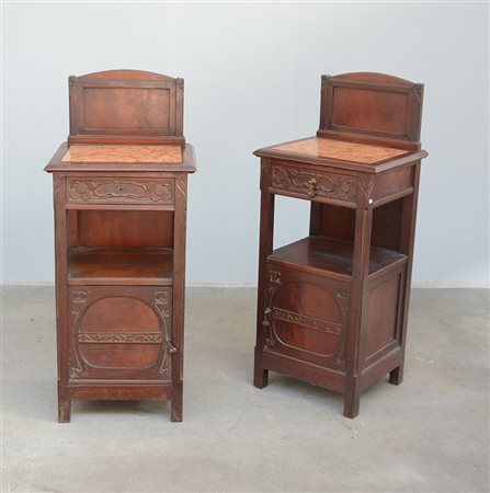 Coppia di comodini liberty in legno con intagli a foglie e fiori stilizzati, piano in marmo rosso e piano a giorno fra il cassetto e lo sportello, e piccola alzatina (cm 43x105x38) (difetti)