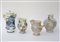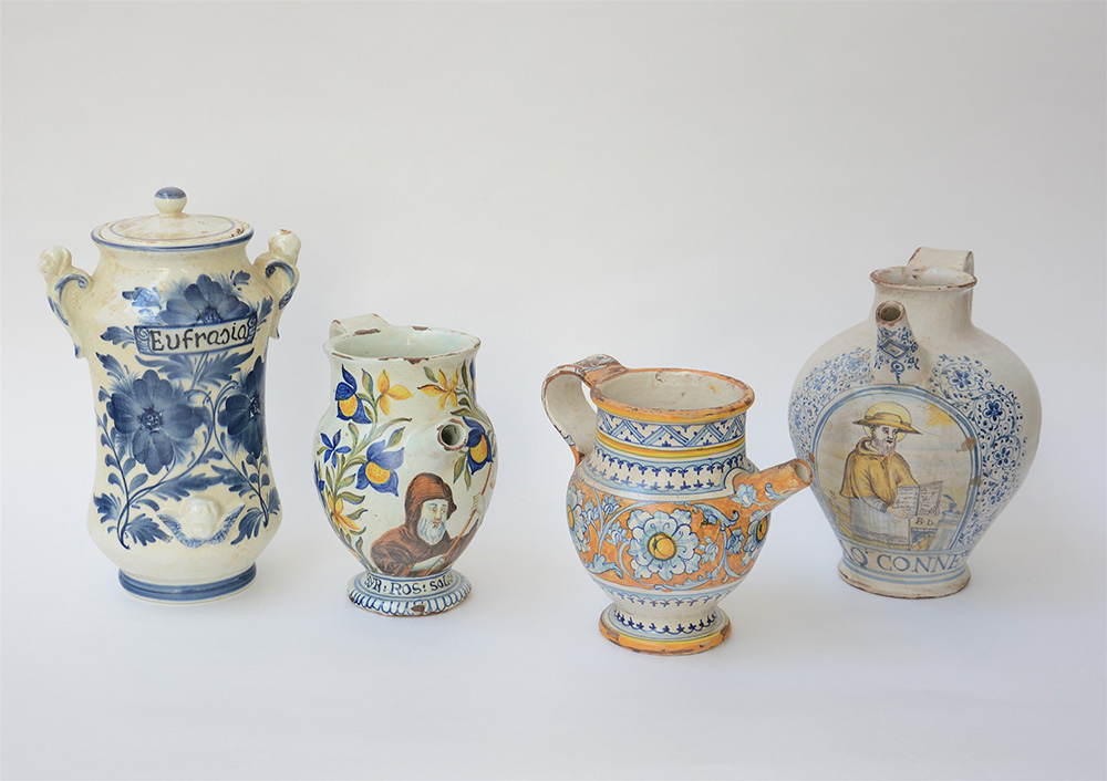 Lotto composto da tre brocche ed un vaso da farmacia con coperchio in ceramica policroma con decori dall'antico, misure diverse (difetti)