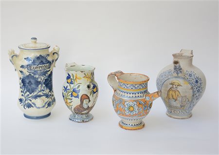 Lotto composto da tre brocche ed un vaso da farmacia con coperchio in...
