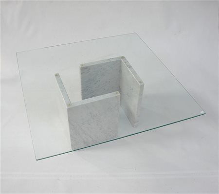 Tavolino da salotto moderno con piano in vetro e gambe in marmo (cm 80x35x80)