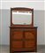 Commode liberty ad un cassetto sottopiano e quattro interni, pannelli con decori intagliati, rami e fiori stilizzati, piano in marmo rosso a incastro; completo di specchiera (mobile cm 121x110x63, specchio cm 112,5x91) (difetti)