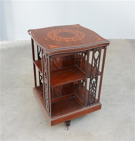 Libreria girevole in mogano intarsiata a motivi vegetali con montanti intagliati e traforati. Inghilterra sec. XIX (cm 53x84x53)