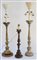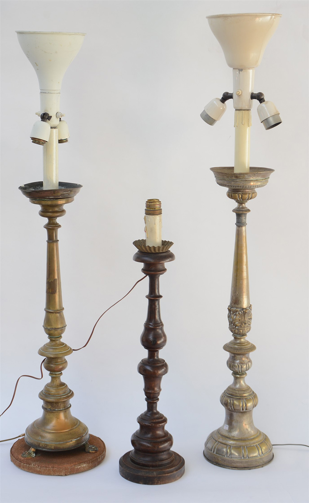 Lotto composta da un candeliere in rame del secolo XIX e due diversi in metallo e legno (montati a luce elettrica, difetti)