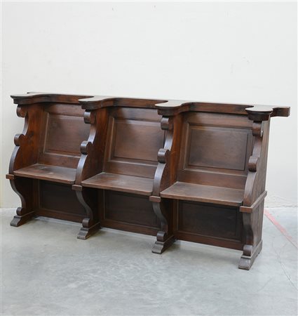 Coro a tre stalli in noce con sedute sollevabili, divisori sagomati a riccioli stilizzati. Lombardia, inizio secolo XX (cm 215x103x48) (difetti)