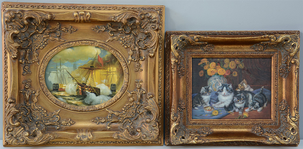 Lotto di due dipinti ad olio raffiguranti velieri e gattini, autori e misure diverse, in cornici (difetti)