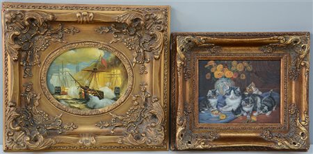 Lotto di due dipinti ad olio raffiguranti velieri e gattini, autori e misure...