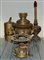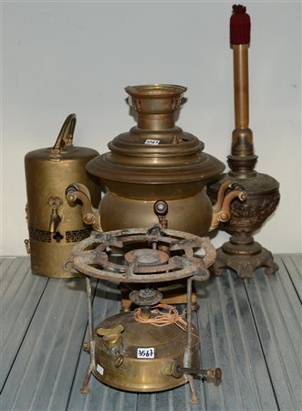 Lotto composto da un samovar, un fornello da tavolo, un contenitore orientale e una lampada ad olio (difetti e mancanze)