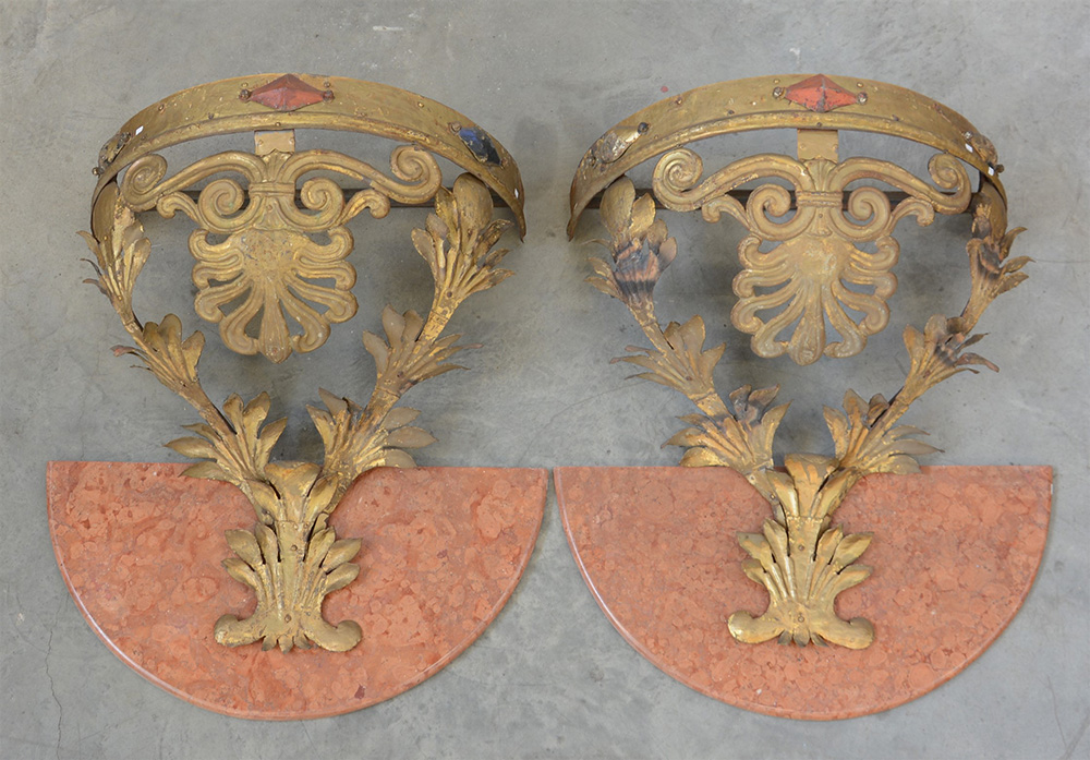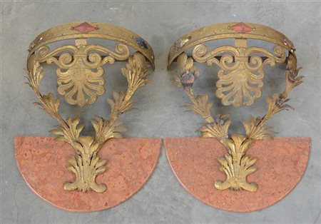 Coppia di capocieli da baldacchino in ferro e lamiera dorata, montati a console con piani in marmo (cm 72x88x38 ca) (difetti, mancanze e restauri)