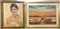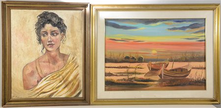 Lotto di due dipinti ad olio raffiguranti paesaggio e volto di donna, autori...
