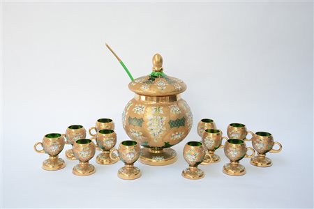 Servizio da punch in vetro con giori e dorature, composta da un contenitore con mestolo e coperchio e dodici tazze