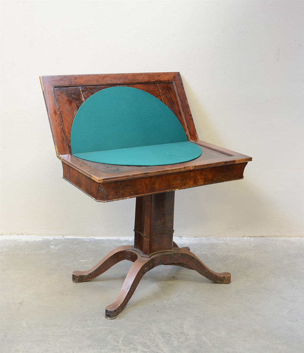 Tavolino da gioco a "libro" lastronato in noce con colonna scantonata su base...