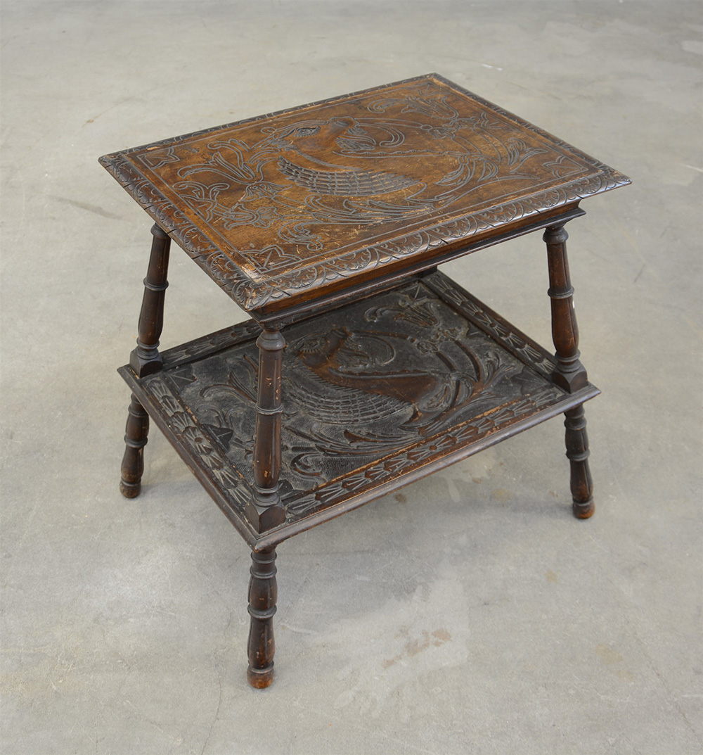 Tavolino di gusto neorinascimentale a due ripiani con decori a intaglio raffiguranti draghi (cm 60x64x45) (difetti)
