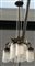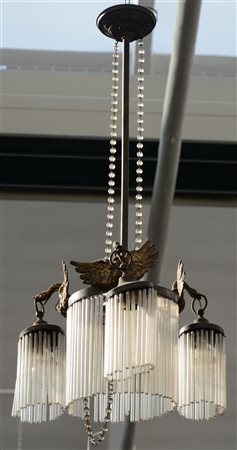 Lampadario a quattro luci con struttura in metallo decorata con cigni e pendagli tubolari in vetro (h cm 84) (difetti)