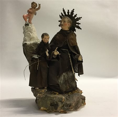 Arte popolare di fine secolo XIX, gruppo scultoreo raffigurante San Francesco e un confratello; volti e mani in gesso dipinto, abiti in tessuto e basamento in cartapesta (h cm 54) (difetti e mancanze)