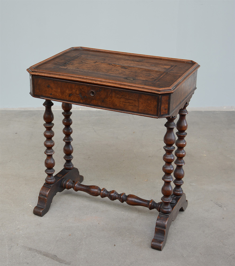 Tavolino da lavoro ad un cassetto con gambe tornite riunite da traversa, piano ad angoli smussati; secolo XIX (difetti e mancanze)