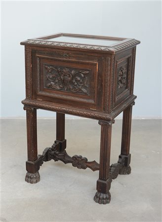 Mobiletto porta posate in legno tinto scuro intagliato di gusto neorinascimentale, con sportello a ribalta celante cinque cassettini con divisori (64x100x50) (difetti e mancante della chiave)