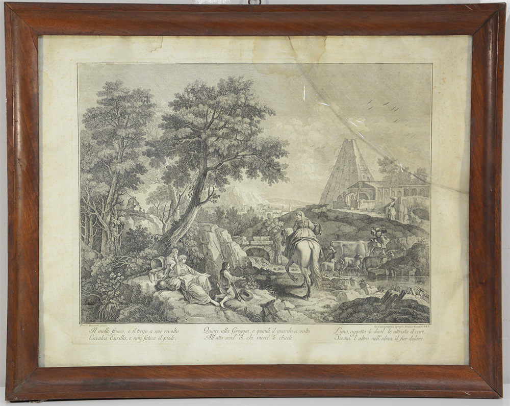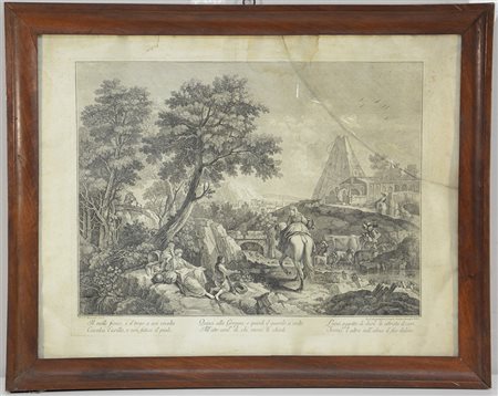 Incisione del secolo XVIII da un'opera di Francesco Zuccarelli, ex calcografia Josephi Ridner, Venezia (foglio cm 50x65) in cornice (difetti)