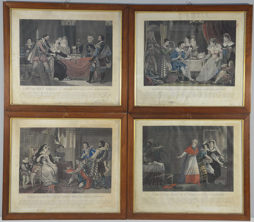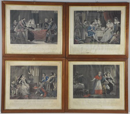 Lotto di quattro incisioni colorate del sec. XIX narranti le vicende di Maria Stuart (foglio cm 38x45), in cornici (difetti)
