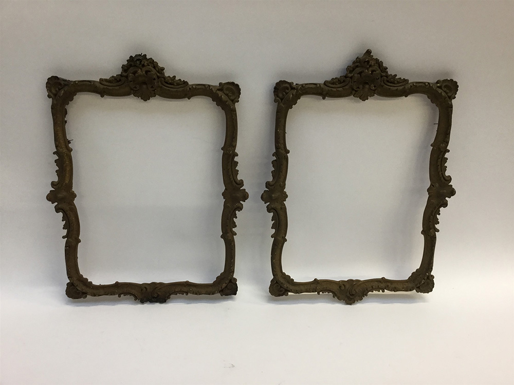 Coppia di cornici in legno e pastiglia a decoro rocaille (luce cm 26,5x35) (difetti)