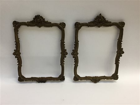 Coppia di cornici in legno e pastiglia a decoro rocaille (luce cm 26,5x35)...
