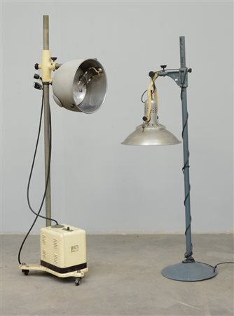 Lotto di due lampade a stelo con fusti in ferro e diffusori in alluminio, di cui uno su ruote (h max cm 166) (difetti)