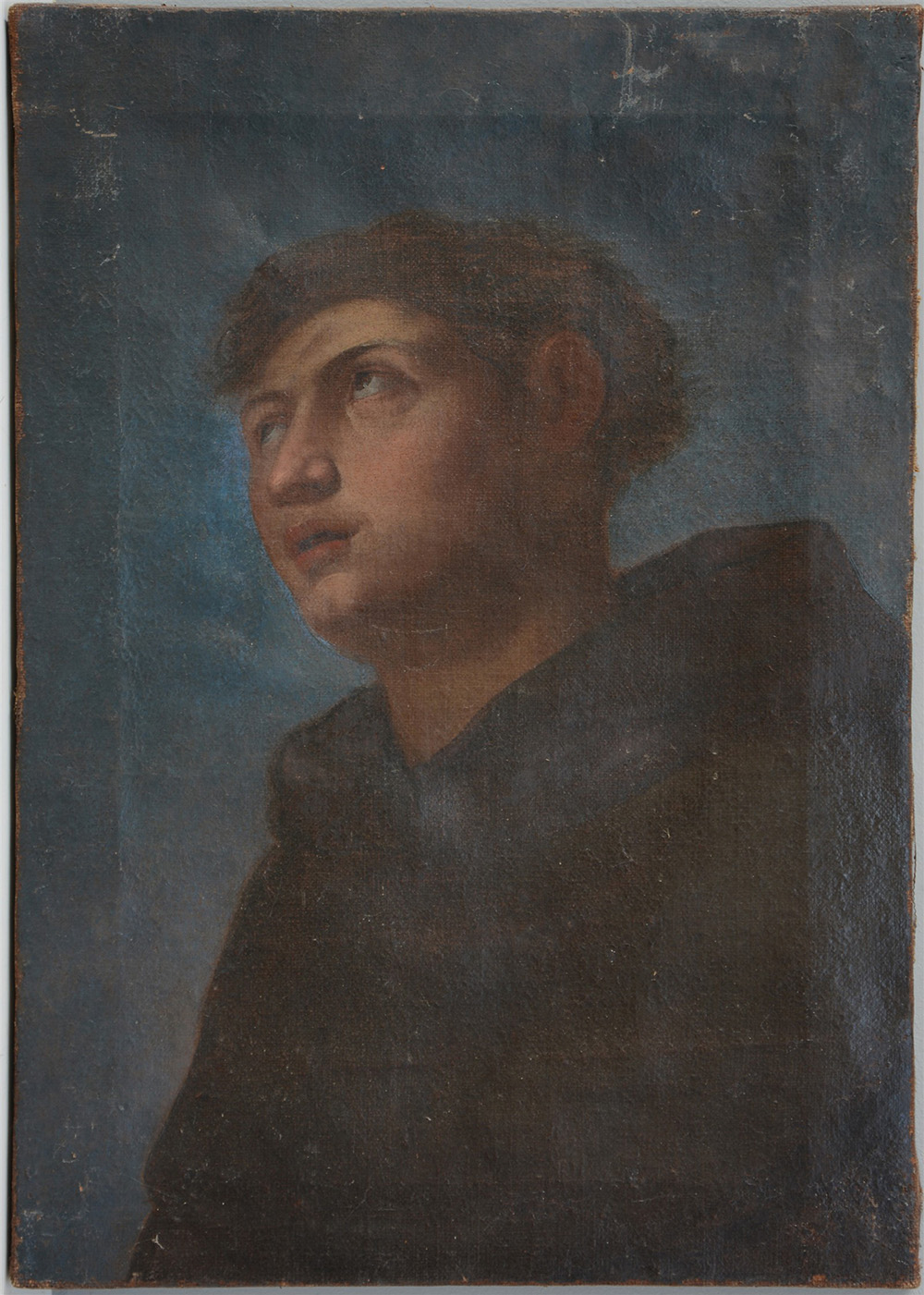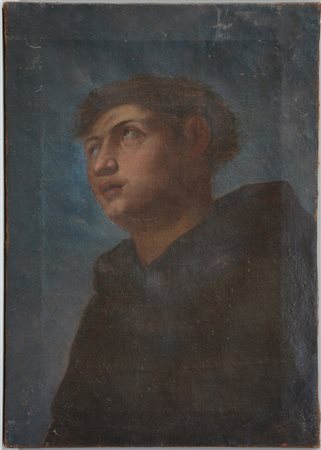 Ignoto "Volto di santo" antico frammento di dipinto ad olio su tela (cm 58x41)(difetti)