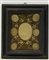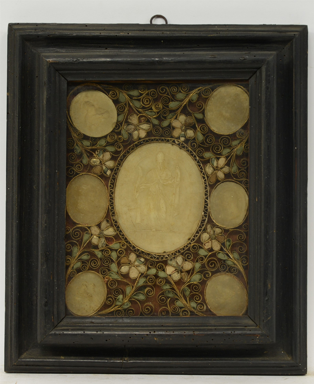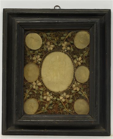 Arte del secolo XIX, composizione con inserimenti di tessuto simulanti foglie e fiori, e sette medaglioni in cera con effigi di santi; cornice coeva in legno ebanizzato (cm totali 36x31) (difetti)
