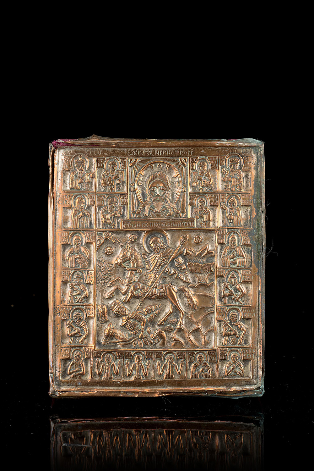 Icona in rame raffigurante San Giorgio e Santi. Sec. XIX (cm 10,5x12) (lievi difetti) -EN A copper icon. 19th century (cm 10.5x12) (minor defects)