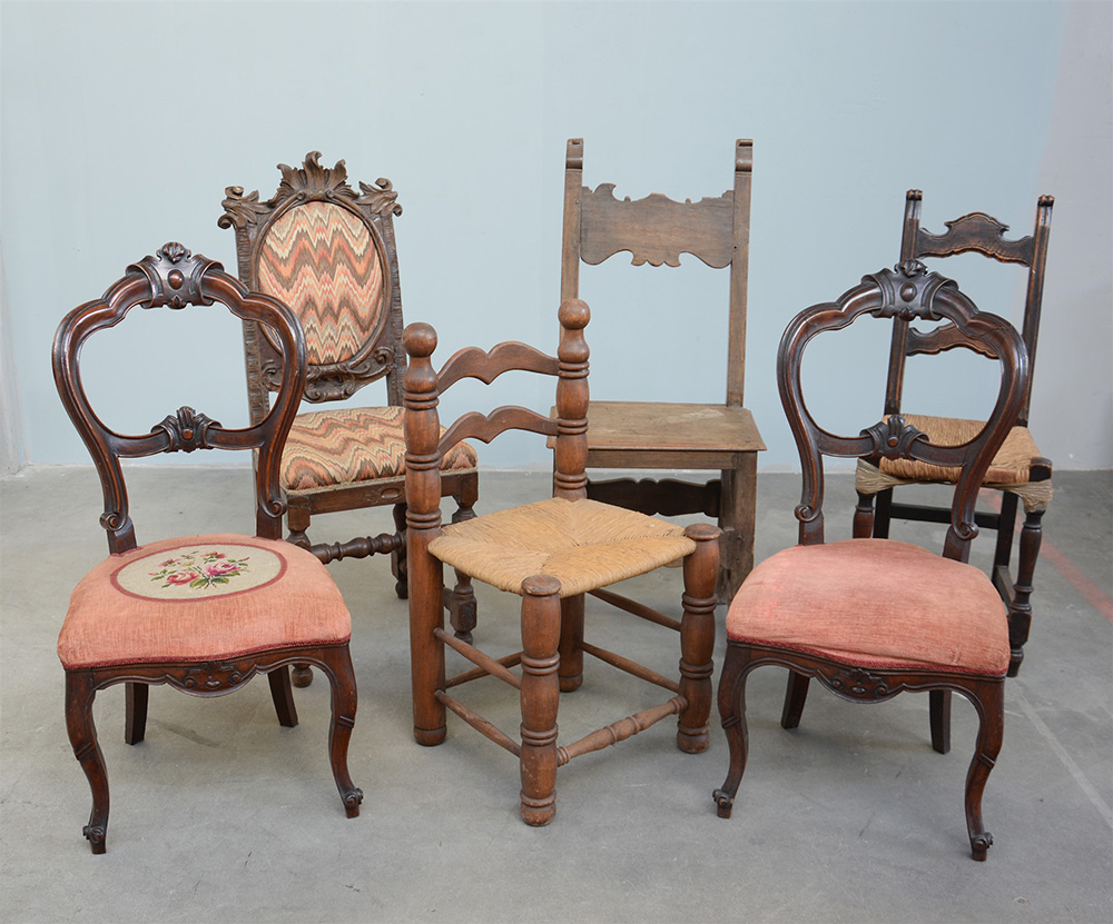 Lotto di sei sedie di fatture ed epoche differenti (difetti)