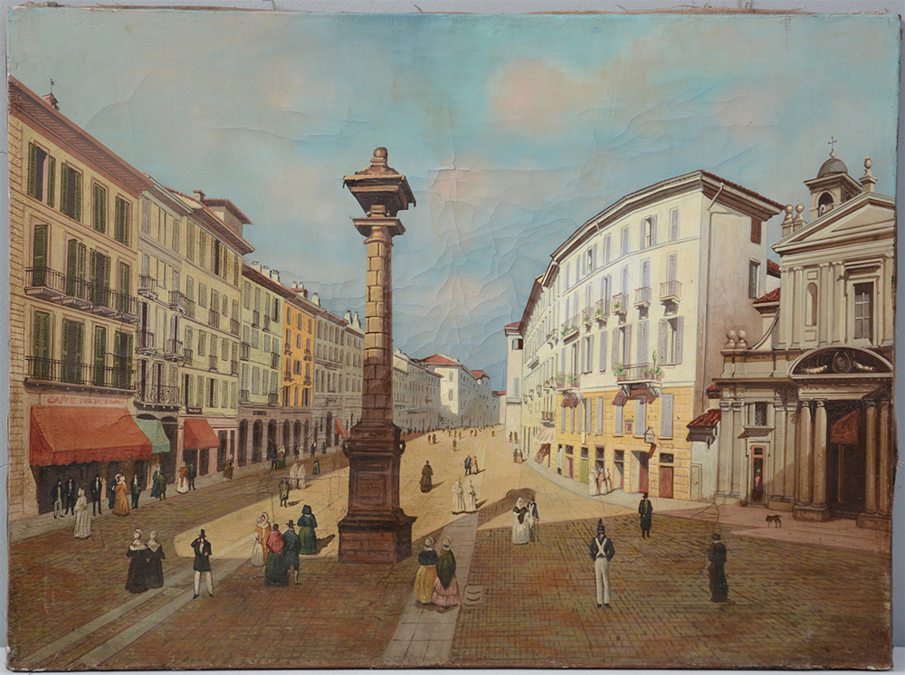 Ignoto "Scorcio di città" olio su tela (cm 51x69)(difetti)