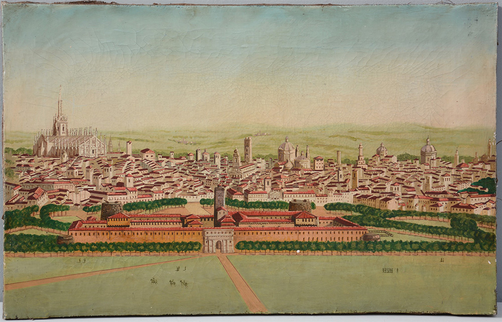 Ignoto "Veduta di Milano a volo d'uccello" olio su tela (cm 42x65)(difetti)