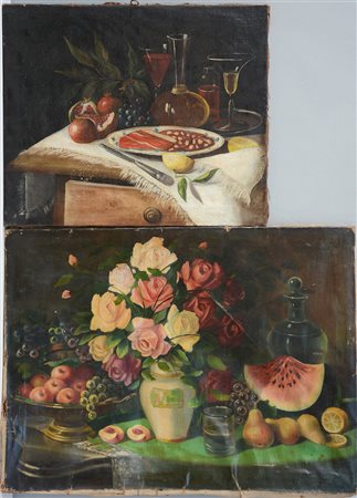 Lotto di due dipinti ad olio raffiguranti nature morte, autori e misure...
