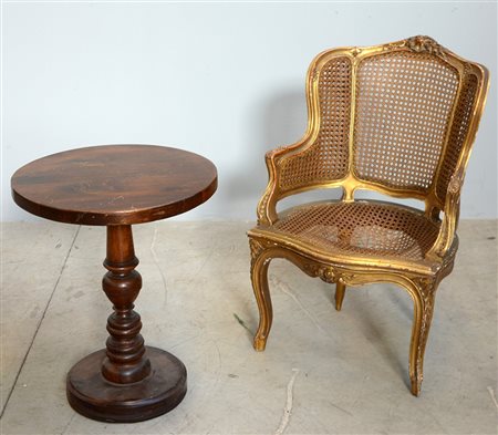 Lotto composto da una poltroncina in legno dorato e un tavolino da salotto con piano tondo (difetti)