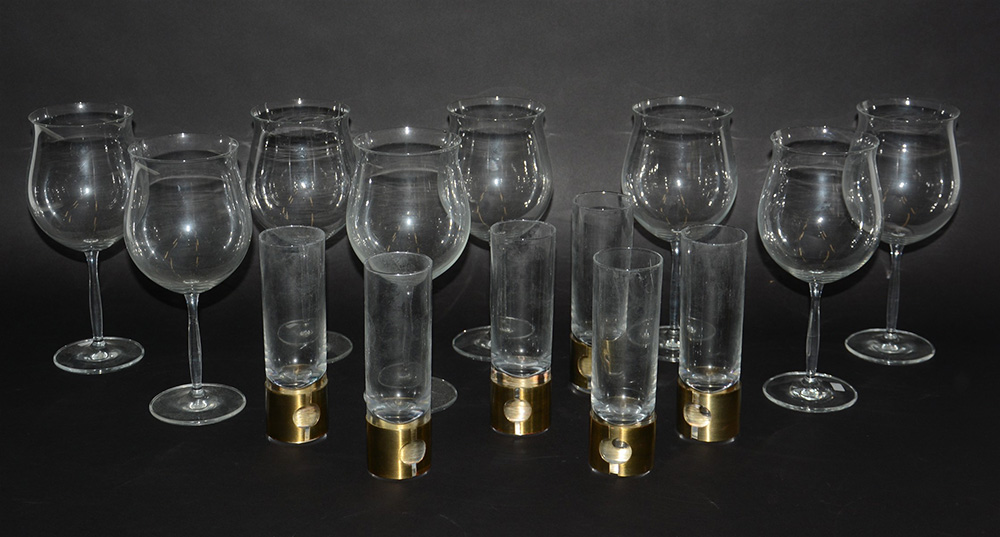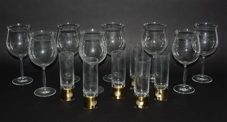 Cartone contenente otto calici da degustazione e sei bicchieri cilindrici con fascia in metallo (lievi difetti)