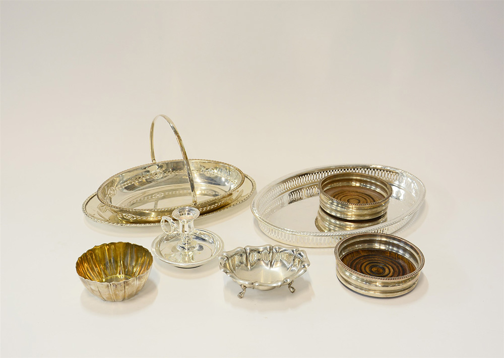 Lotto composto da tre vassoi ovali, un'alzatina, una ciotola, due sottobottiglia e una bugia in metallo argentato (lievi difetti)