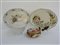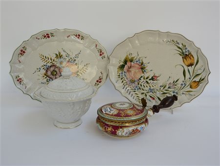 Manifatture diverse, lotto composto da una scatola porta polvere in porcellana, una biscottiera e due vassoi ovali a decoro floreale (difetti)