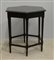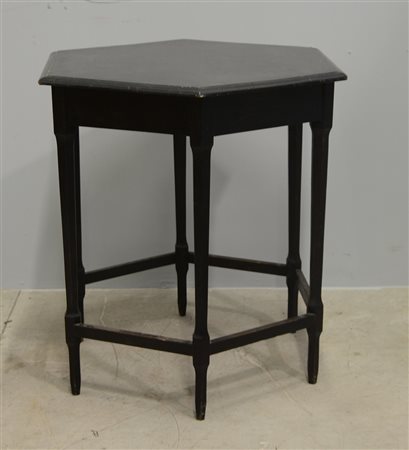 Tavolino esagonale in legno ebanizzato con gambe rastremate riunite da traverse (cm 65x73x65) (difetti)