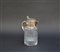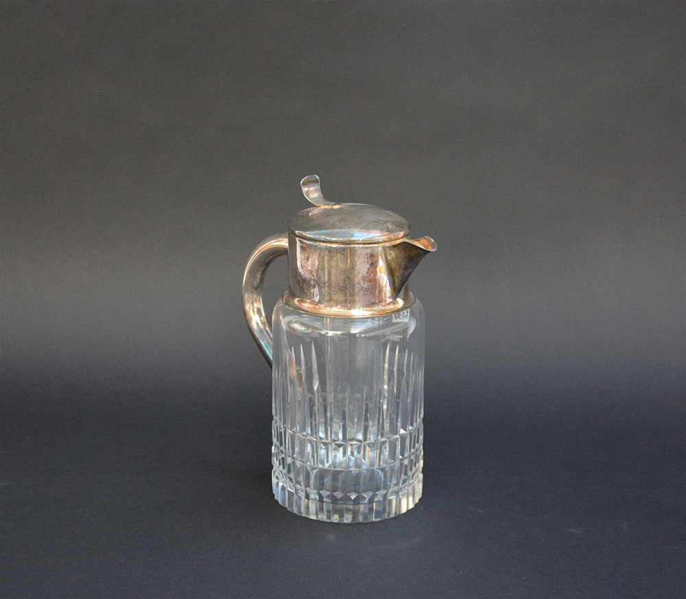 Lotto composto da un versatoio con presa e beccuccio in metallo, una bottiglia da liquore, un candeliere a tre fiamme, due boccette porta profumi e una ciotola in vetro verde (lievi difetti)