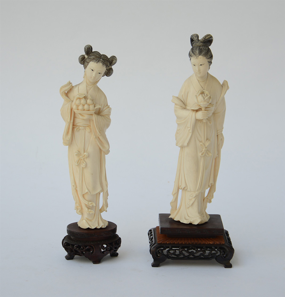 Lotto di due sculture in avorio scolpito raffiguranti figure femminili con basi in legno (difetti) Cina, sec. XX (h. 19 cm.)