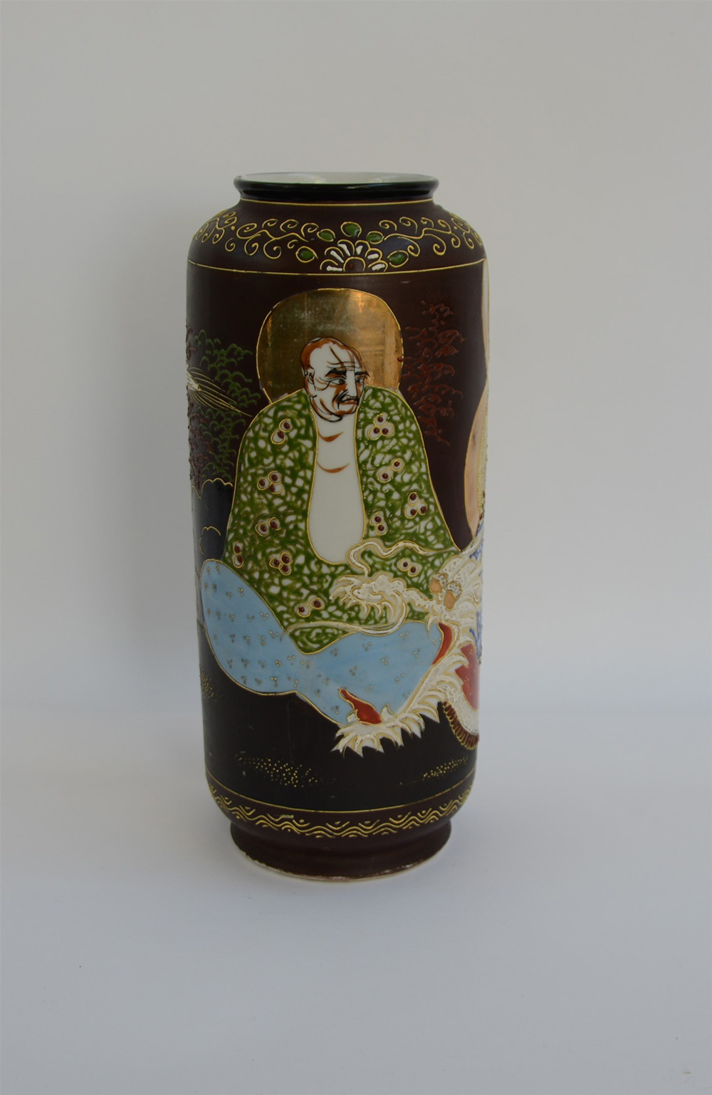 Vaso in porcellana Satsuma a fondo marrone raffigurante monaci Taoisti decorato a dorature e policromia (difetti) Giappone, sec. XX (h. 30 cm.)