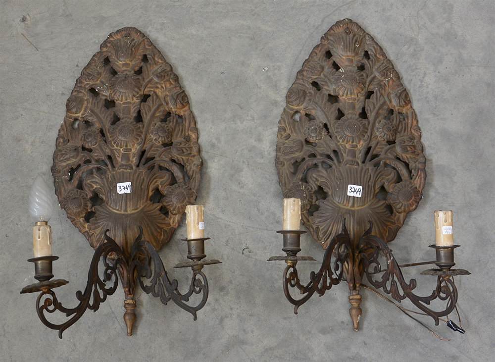 Coppia di antichi fregi in rame intagliato e sbalzato a cespo di fiori, trasformati in reggi-candele a due braccia ed elettrificati (cm 29x54x24) (difetti)