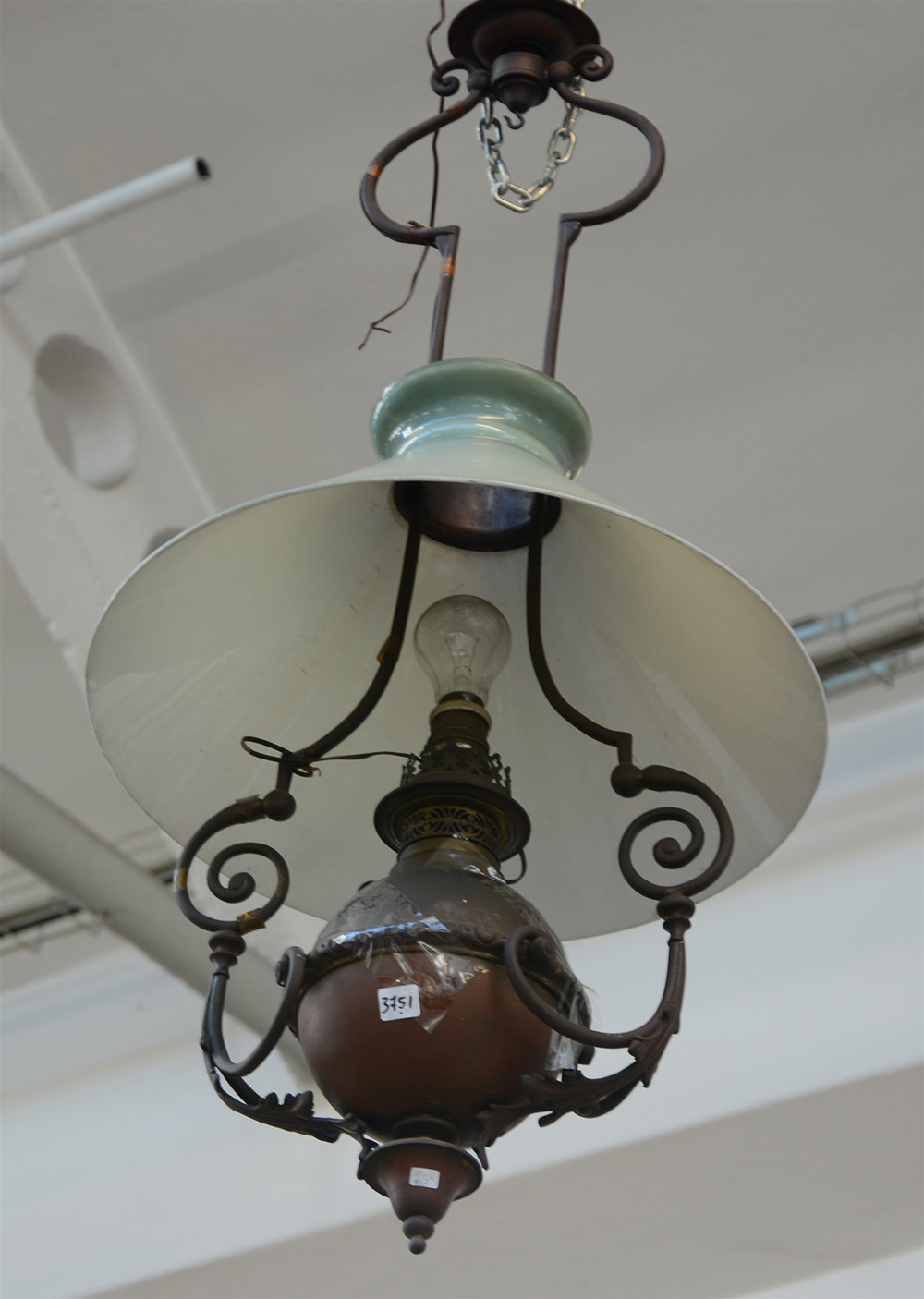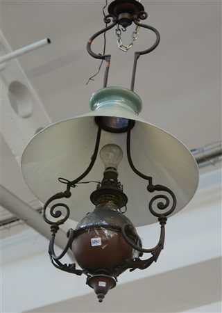 Lampada ad olio montata a luce elettrica con paralume in vetro verde (h cm 94)(difetti)