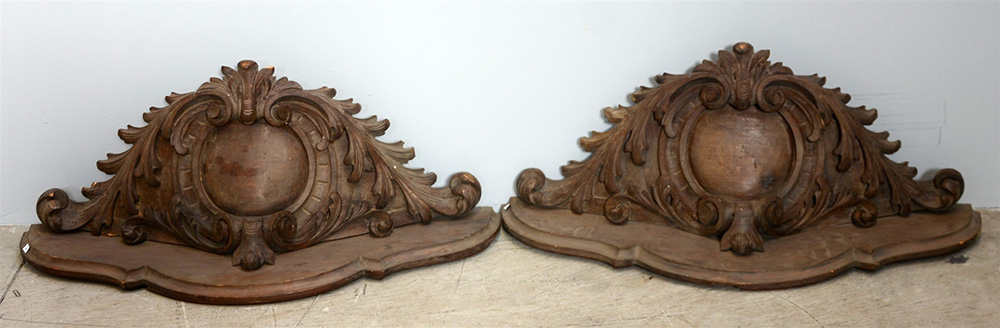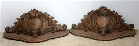Coppia di mensole di forma sagomata in legno intagliato a motivi vegetali e volute. Fine sec. XIX