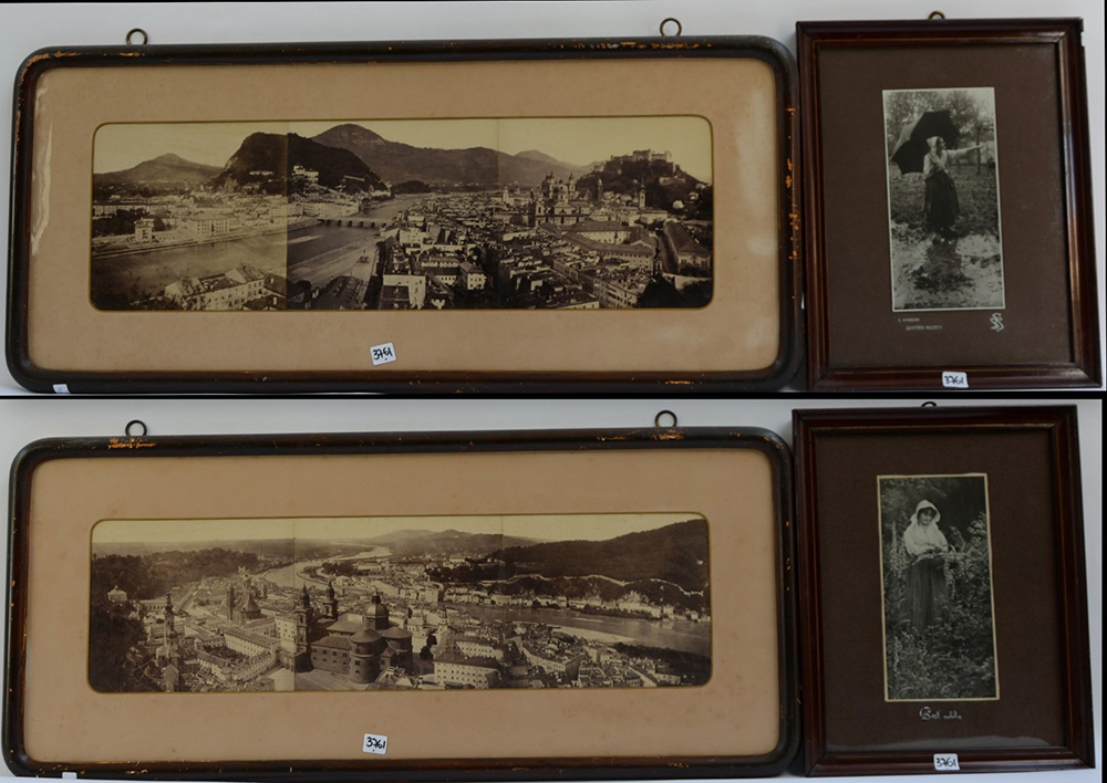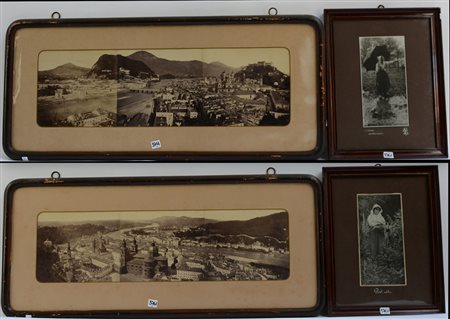 Lotto composto da due stampe alla gelatina e sali d'argento, firmate al recto Ed. Garrone, 1905, unite a due vedute panoramiche all'albumina, in cornici (max cm 80x35) (difetti)