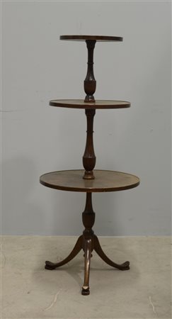 Etagere a tre ripiani tondi con montante tornito e piedi sagomati. Sec. XX...
