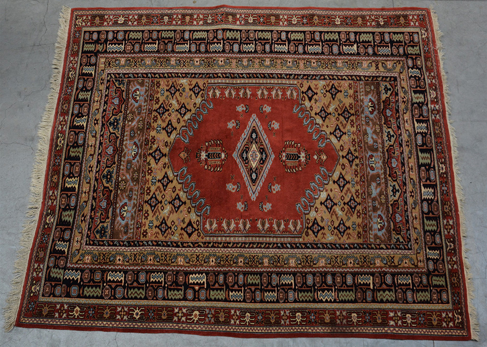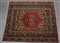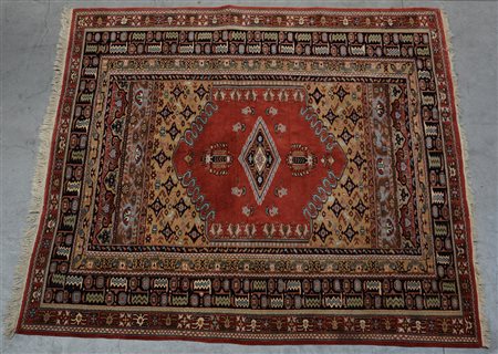[Tappeti] Tappeto Kars, , secolo XX. Disegno a medaglioni su fondo marrone. Angolari a cammello con molteplici bordure policrome (cm 237x206) (difetti)