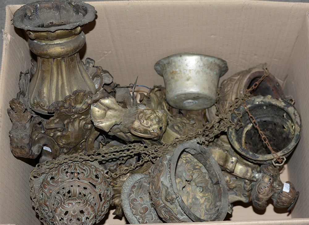 Lotto composto da due lampade votive e due antichi turiboli in metallo sbalzato (difetti e mancanze)